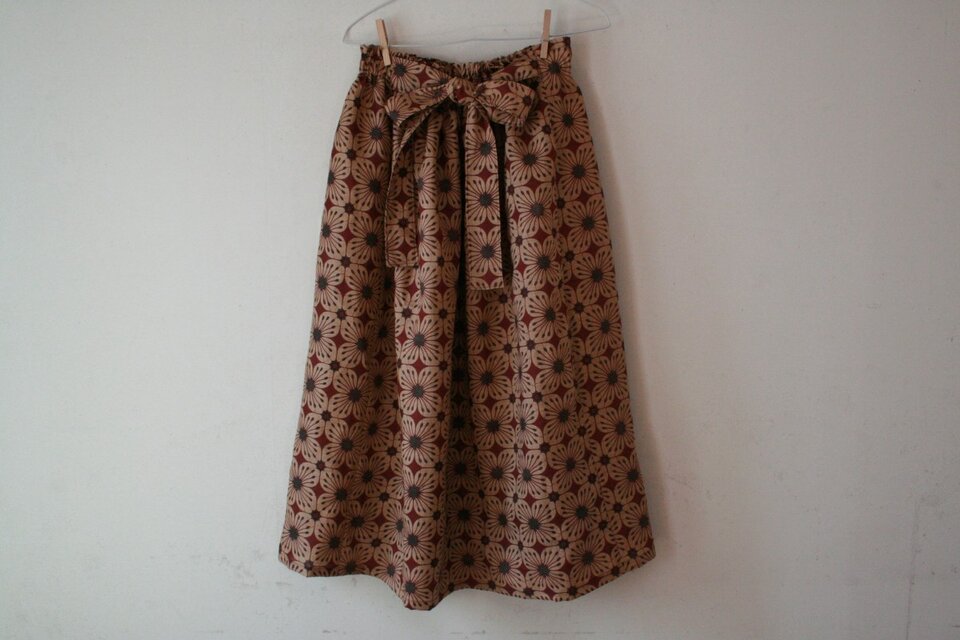 落ち着いた色味が素敵な麻生地でゴムスカートを作りました。ゴムを通すことで自然なギャザーができるシンプルなスカートです。ロング丈ですが、ベルト部分のリボンで可愛らしい印象になります。
