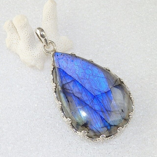 鮮やかなブルーの輝きが美しい大粒ラブラドライトを小花があしらわれた飾り枠でシンプルなペンダントに仕上げました。