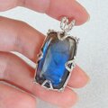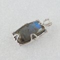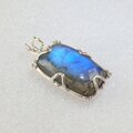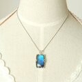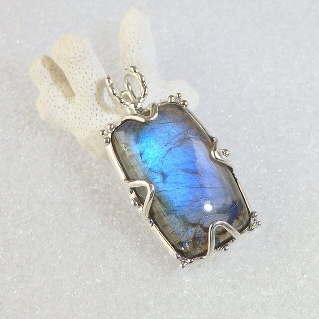 鮮やかなブルーの輝きが美しいラブラドライトを石枠の隅に粒飾りを添えたペンダントに仕上げました。