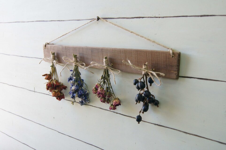 自家製ドライフラワーを古材風に加工した板にセットしました。