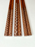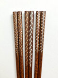 箸木に漆を何度も摺り込むことでつやを出し、平蒔絵で模様を描きました。