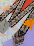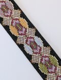 黒をベース色にし、ゴールド、ピンク、グリーン、ブルーの丸いモチーフをつなげたオリジナルの幾何学模様のラリエットです。