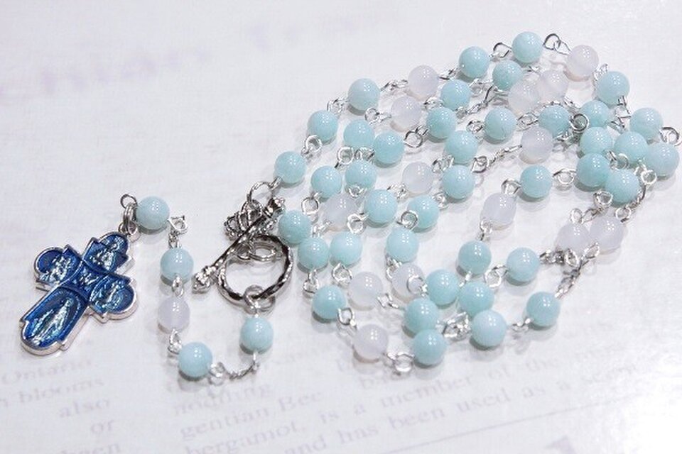 優しい色合いのパステルカラーアマゾナイトとホワイトカルセドニー、相性の良いとされる組み合わせで癒やし効果がアップしたロザリオ風ネックレス。