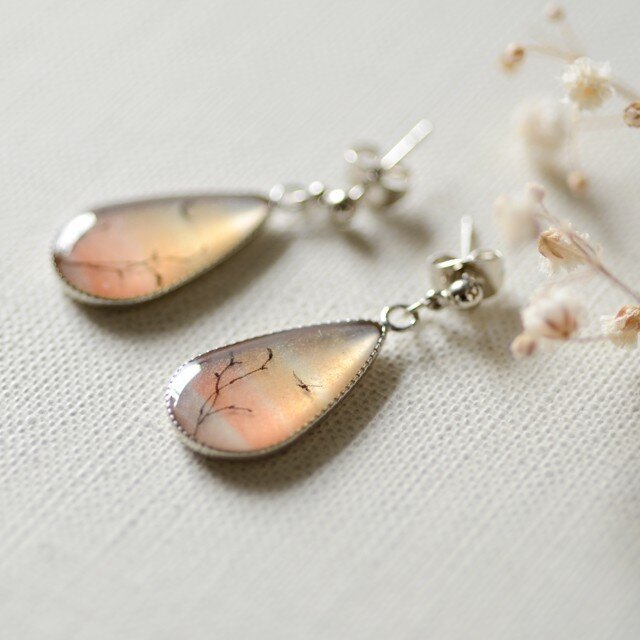 鳥とペンペン草を描いた絵を、樹脂で閉じ込めたピアスです。