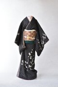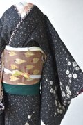 はらりはらりと舞う雪に咲き始めたばかりの梅も薄化粧をしたようなシックな縮緬の長着は、元々は絵羽織でした。比翼や袖口、伊達衿に使った菱文様の縮緬と、金色でかわいい木のような文様のモダンな帯が小粋な雰囲気をかもし出します。