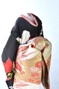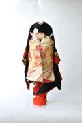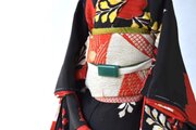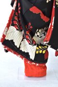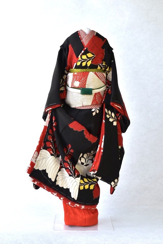 舞妓こべべは、長着・中着の二枚重で裾の袘(ふき)には綿を入れ重厚感を出し、襦袢からすべて手縫いで仕立てあげ着付けております。実際の舞妓さんのお着物同様肩とお袖部分に揚げを施し、帯は舞妓さん特有のだらり帯に仕上げています。
