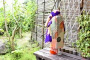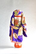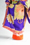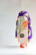 舞妓こべべは、長着・中着の二枚重で裾の袘(ふき)には綿を入れ重厚感を出し、襦袢からすべて手縫いで仕立てあげ着付けております。実際の舞妓さんのお着物同様肩とお袖部分に揚げを施し、帯は舞妓さん特有のだらり帯に仕上げています。