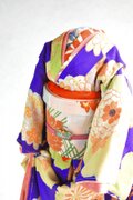 きれいな本紫の地色に優しい色合いの菊や梅などの花文様が描かれた長着は昔の七五三の着物だったものです。 大胆な松毬文様の入った淡い珊瑚色の名古屋帯が長着の柄とも合い、奇抜な柄の半衿が粋な、どこか懐かしさのある舞妓こべべです。
