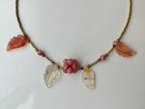 使用石:ミックスカーネリアン(リーフ)、レッドオレンジカルセドニー(ラウンド・6mm ※染色・アンティーク加工)、パイライト(ラウンドカット・3mm)、ヘマタイト(ラウンド・2mm ※人工石、金属加工)