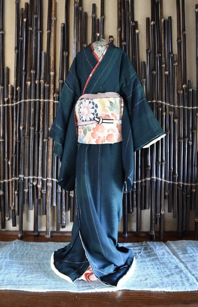 深緑のシンプルな長着に、菊や牡丹などの花文様とお太鼓部分には珍しい笛文様が描かれたレトロな帯(元袋帯)が、とても良く映えた粋なこべべです。