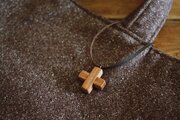 シンプルなバッグのポイントに檜の木で作ったクロスチャームを付けました。