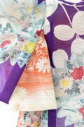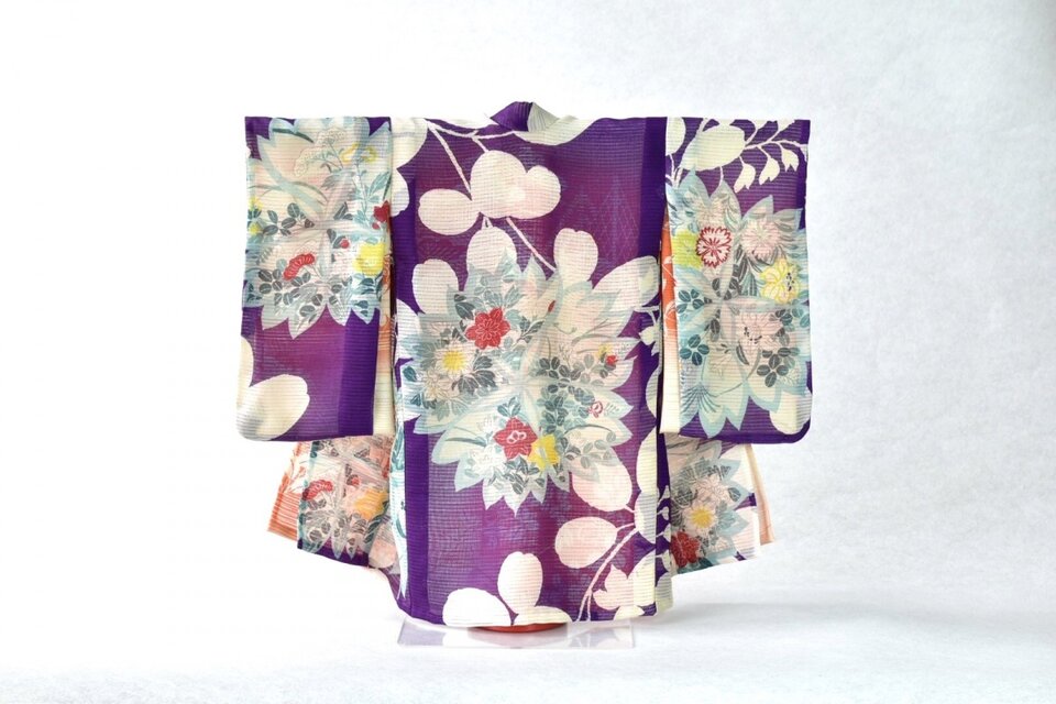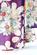 本紫の地色に艶やかな花々の文様、重ねの中着の橙色が光を通して薄っすら浮き出る様子が素敵なこべべです。