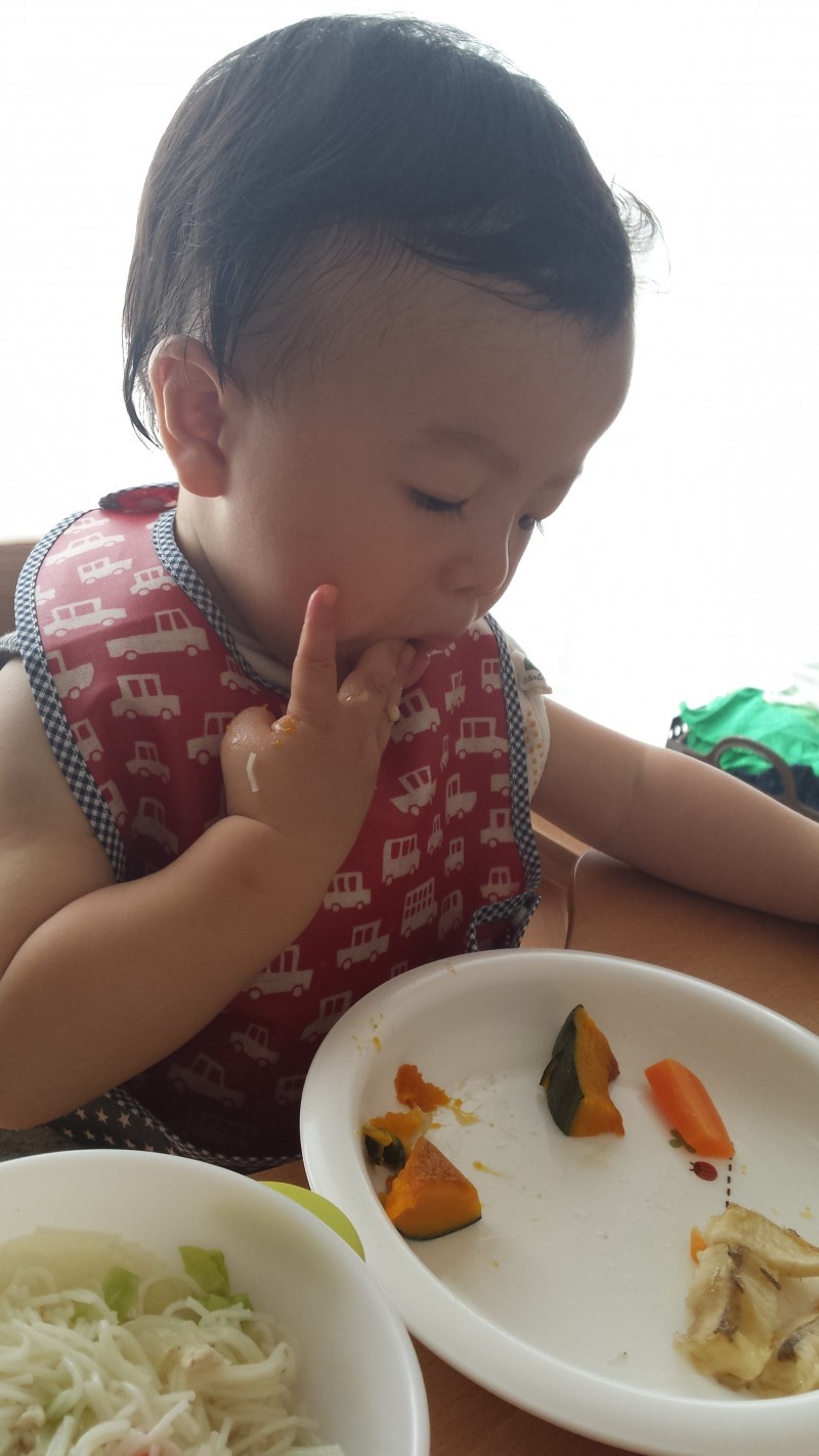 色々付けるのが嫌いで、エプロンもすぐに外したがる2歳の息子が、目を輝かせてエプロンをつけて、お食事を楽しんでいます。