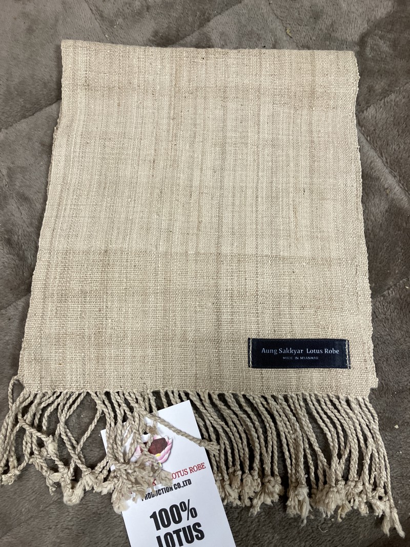 蓮布はミャンマーインレー湖でとれる蓮の茎を折って抽出した粘り気のある繊維を何本も縒り合わせ糸を作り、織り機で織り上げた世界でも非常に珍しい布です。