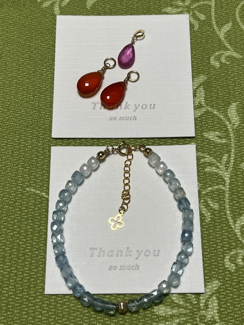 どちらも質の良い素敵なお品で、この夏たくさん身に付けたいと思います。アクアマリンはほんとに氷のイメージですね!いつも素敵なオマケもありがとうございます☺️