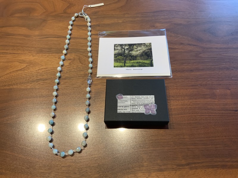 とっても素晴らしいネックレスでした。写真で見ても美しかったのですが、実物はさらに美しいです。一つ一つの石もビンテージパーツもきれいで、見惚れてしまいます。身につけたときに、着ているお洋服が見違えるほど素敵になりました。
