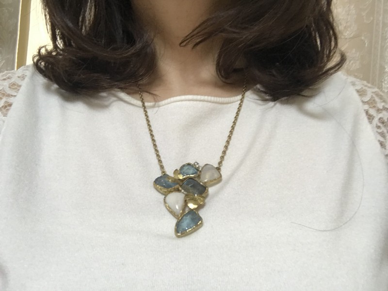 すてきなネックレスです。今日たまたま着ていた淡い黄色のセーターに合わせてみたら、ぴったりでした。ネックレスのグリーンの部分は手持ちのコートと同じ色があり、嬉しかったです。