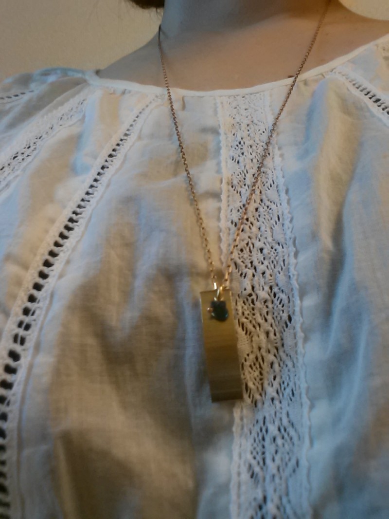 今は寒いのでタートルネックの上につけてますが、春になったら素肌にのせつけてもさわやかで素敵だと思います。