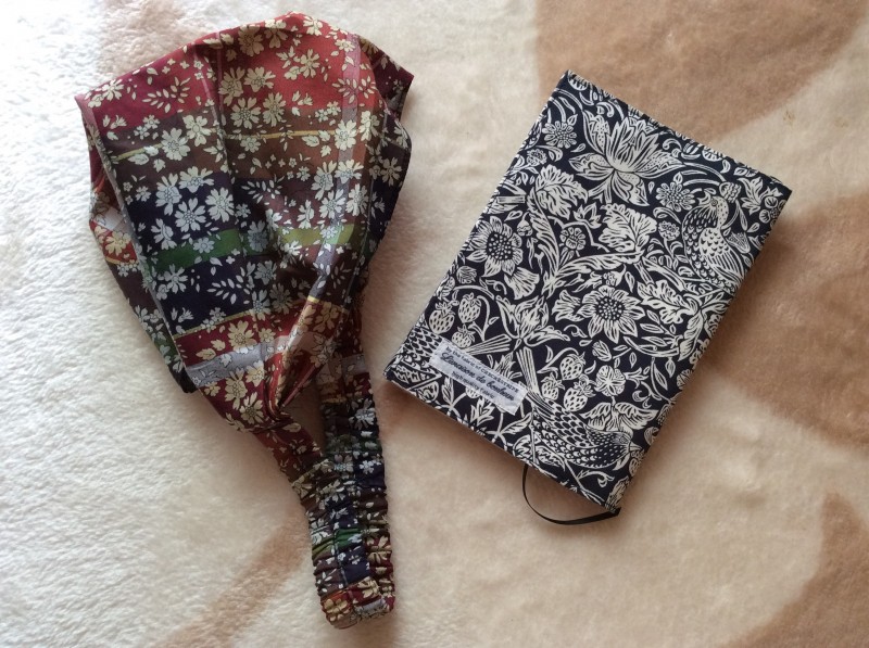 ショートカットの髪ですが、顔の手入れをする時に使いたいなぁと思って購入。先日のブックカバーと一緒でリバティの中でも今まであまり見かけない色柄で、とても気にいっています。ブックカバーはとてもしっかりした作りで、ヘアバンドは柔らかくて優しいです。