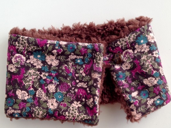 リバティのコーデュロイ生地がプードルファーとあっていてすてきです。革のクルミボタンも可愛いです。