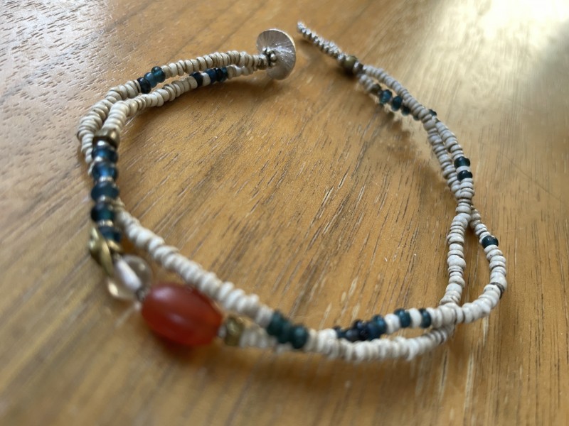 シャン族ヴィンテージカーネリアン&古代水晶、ホワイトビーズ、インディゴブルーブルービーズ、oldオリッサブラスの華奢な2連ブレス