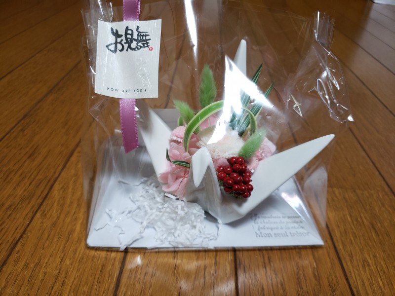 実物は手のひらサイズで、折り鶴の陶器に優しい色合いのプリザーブドフラワーが私たち家族の伯母への気持ちにぴたりと合っています。