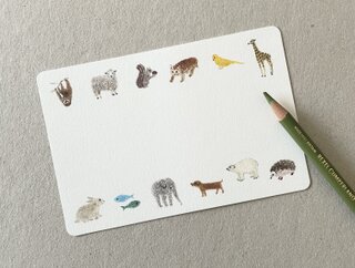 ざらっとした紙に色鉛筆や水彩絵具などで絵や文字を描いて小さな紙ものを作っています。