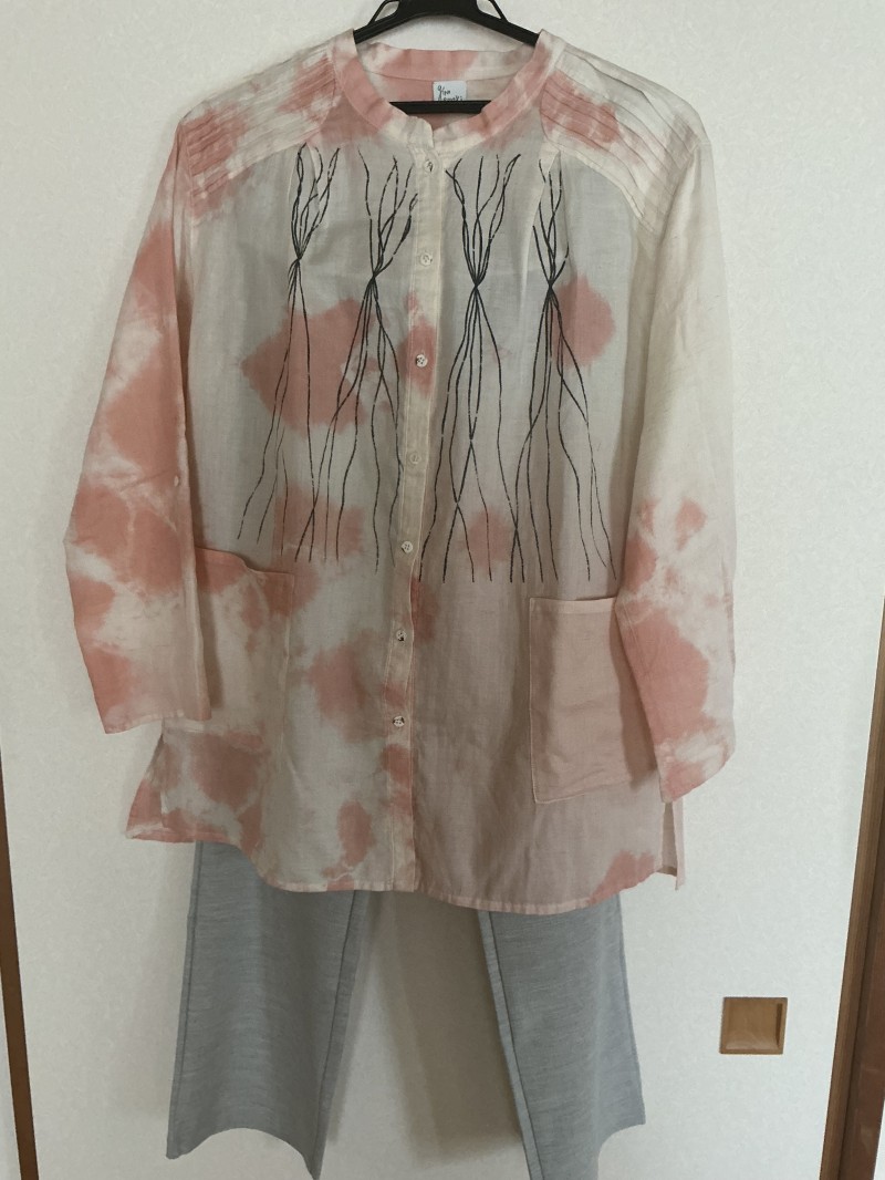ハンドプリントシャツ、素敵です。肩のタックがおしゃれ。もう少し暖かくなったら旅行に着ていくつもりです。惑星アイテムは可愛らしいだけでなく、いろんな使い方ができそうですね。素晴らしい2点の作品をどうもありがとうございました。