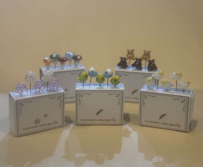ガラスで作ったオカメインコの待ち針 (他4点)