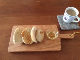 お昼前に届けていただいたのでチェリーのカッティングボード、さっそく使いました(テーブルもチェリーです)。