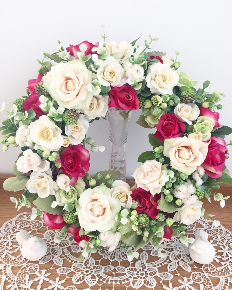 ピンクのバラで、黄緑も少しはいった可愛らしいリースを探していました。理想以上の可愛さで一目惚れでした。