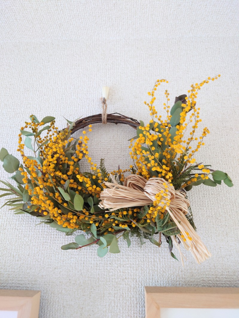 とっても可愛い🩷ミモザのリースが届きました。ありがとうございます。我が家の玄関にキラキラと輝く春が訪れたようです。