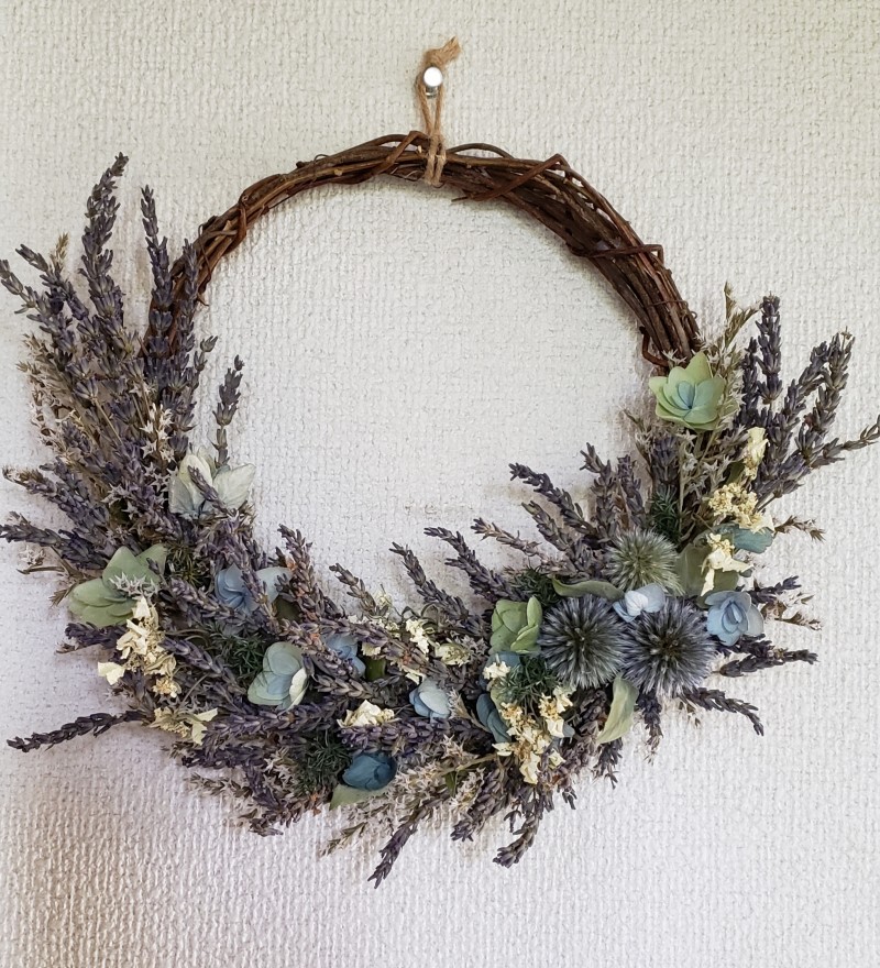 玄関に飾っています。ラベンダーの良い香りと夏草の清々しさに癒されます。ブルーの紫陽花、ルリ玉アザミが素敵です。