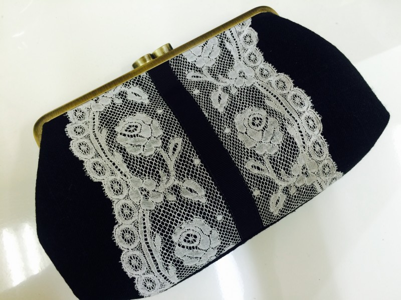 黒リネン&アンティークヴァレンシエンヌレースがま口巾18