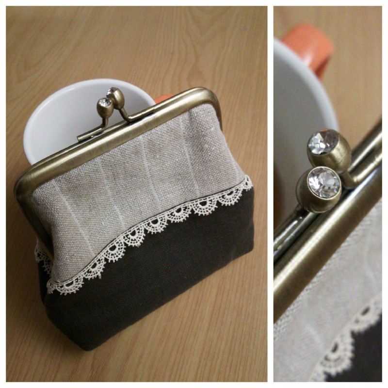 アンティークレースドイリー モカリネン がま口ポーチ (他1点)