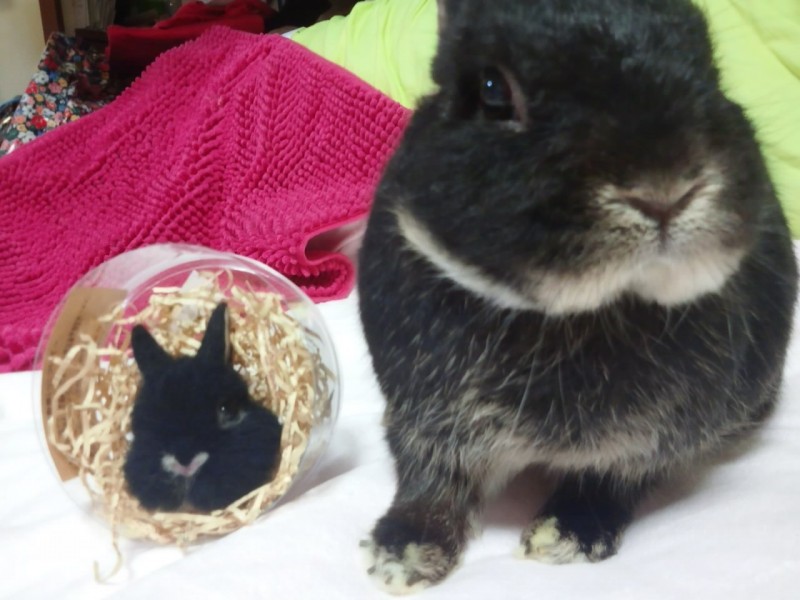 本日届きました。我が家のうさぎさんそっくりで、とても嬉しいです。ありがとうございます。ブルーのは小さい頃に似てて、今回は大人になった今のお顔に似てて、もう最高です。