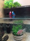 大切に育てている金魚。1匹で少し寂しい感じがしていたのですが、ガラス蓋にとまった ピンクとブルーの小鳥で華やかになりました。