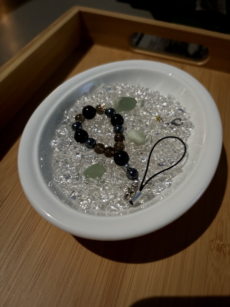 とてもきれいなストラップをありがとうございました。満月の日に届いたのも何か幸先良い感じがして、うれしかったです。クリスタルのチャームの他に、おまけの石も入れていただいて、そのどれも本当にきれいな石でした。浄化して発送していただいているということでしたが、せっかくの満月なので月光浴をしました。明日から使うのが楽しみです。