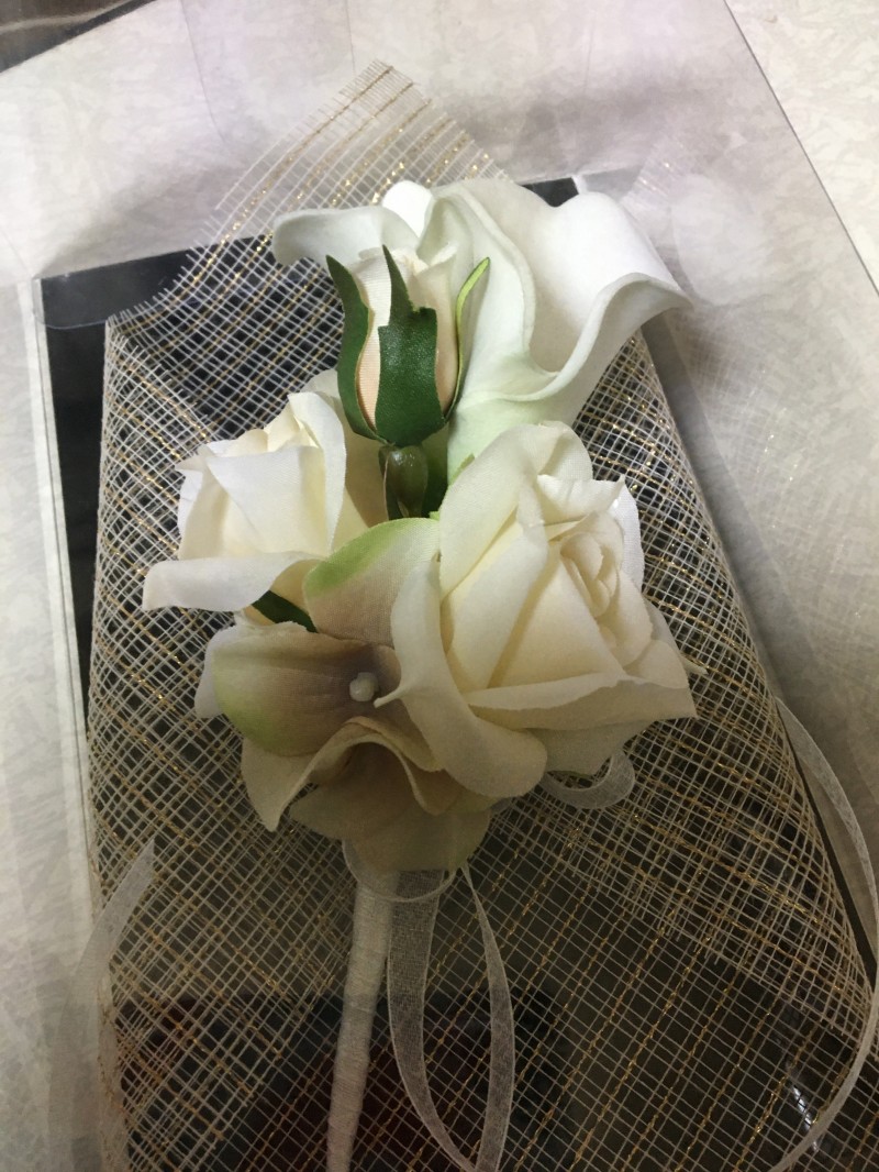 カラーが花材という珍しさ、縦ラインで、とてもスカッとした上品なコサージュです。