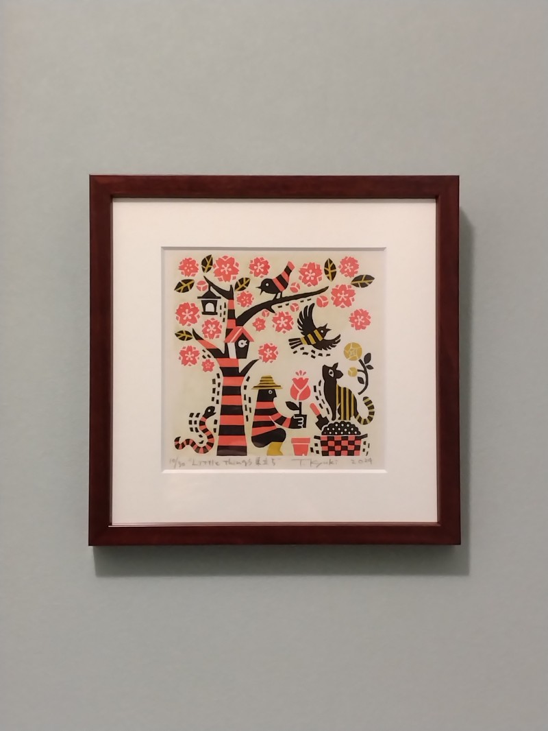 大きな絵はまだまだ購入出来ずで、こちらの作品を購入させて頂きました。小さいですがとても存在感があり、手作業の温もりが感じられます。子どもが次々巣立ち、がらんとした空間に飾りました。泣きそうです。