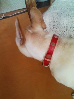 パソコンやっと復活しまして、お礼が遅くなりました。クリームで背中がこんがりトースト色のニッキに似合う首輪をありがとうございました!とってもとっても可愛いです!良い色の赤にピンクのドットが可愛い(≧▽≦)