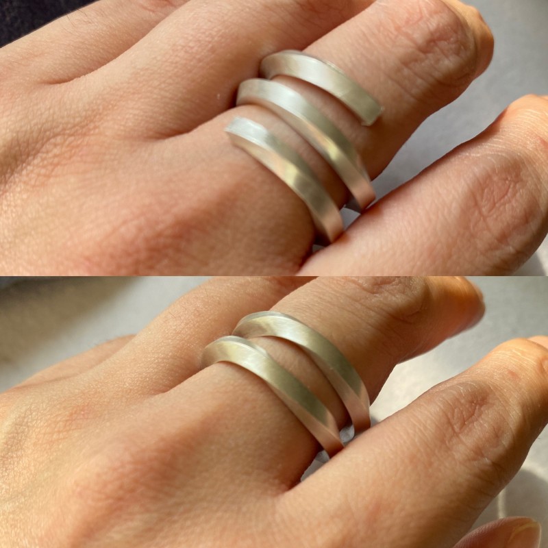 4㎜の槌目は模様がキレイすぎて泣きそうになりました。鏡面は重ね着けでも複数の指に着けたときでも3㎜の存在感が邪魔しません。