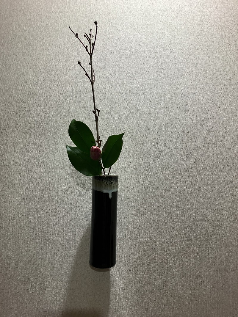 家には玉の浦椿とサンシュユでスッキリ生けてみました